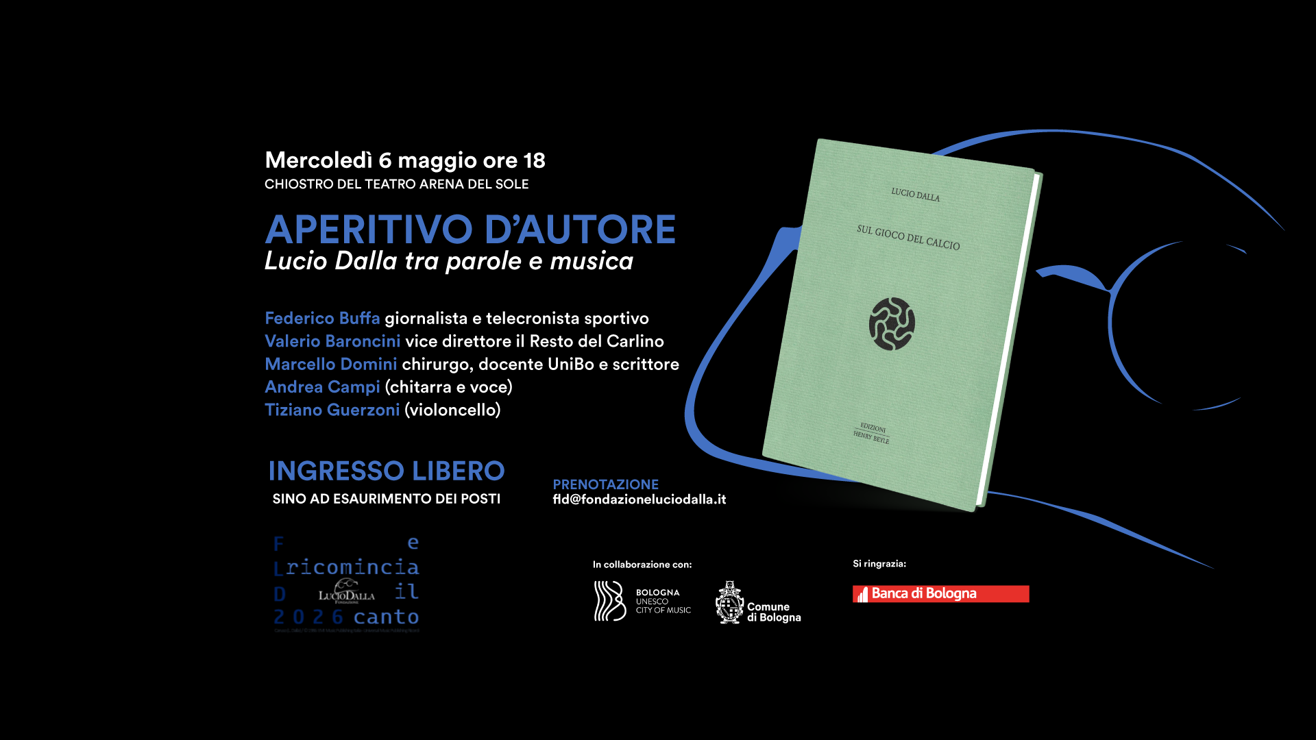 Mercoledì 6 maggio alle ore 18, presso il Chiostro del Teatro Arena del Sole, si terrà l’evento dedicato a Sul gioco del calcio, volume che riporta alla luce un sorprendente testo di Lucio Dalla, nella preziosa edizione curata da Vincenzo Campo, fondatore delle raffinate Edizioni Henry Beyle, che introdurrà l’incontro.